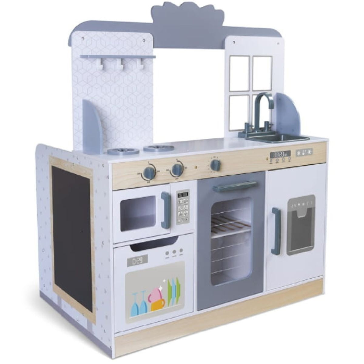 De set bevat vier houten accessoires — een pan, lepel, pot met deksel en spatel — die het spel compleet maken. Alles is gemaakt van natuurlijk hout en gekleurd met kindvriendelijke, niet-giftige verf. Met afmetingen van 110 × 61,5 × 92,5 centimeter biedt het meubel voldoende ruimte om samen te spelen zonder de kamer te overheersen. De stevige constructie zorgt voor stabiliteit en veiligheid, ook bij actief spel.
