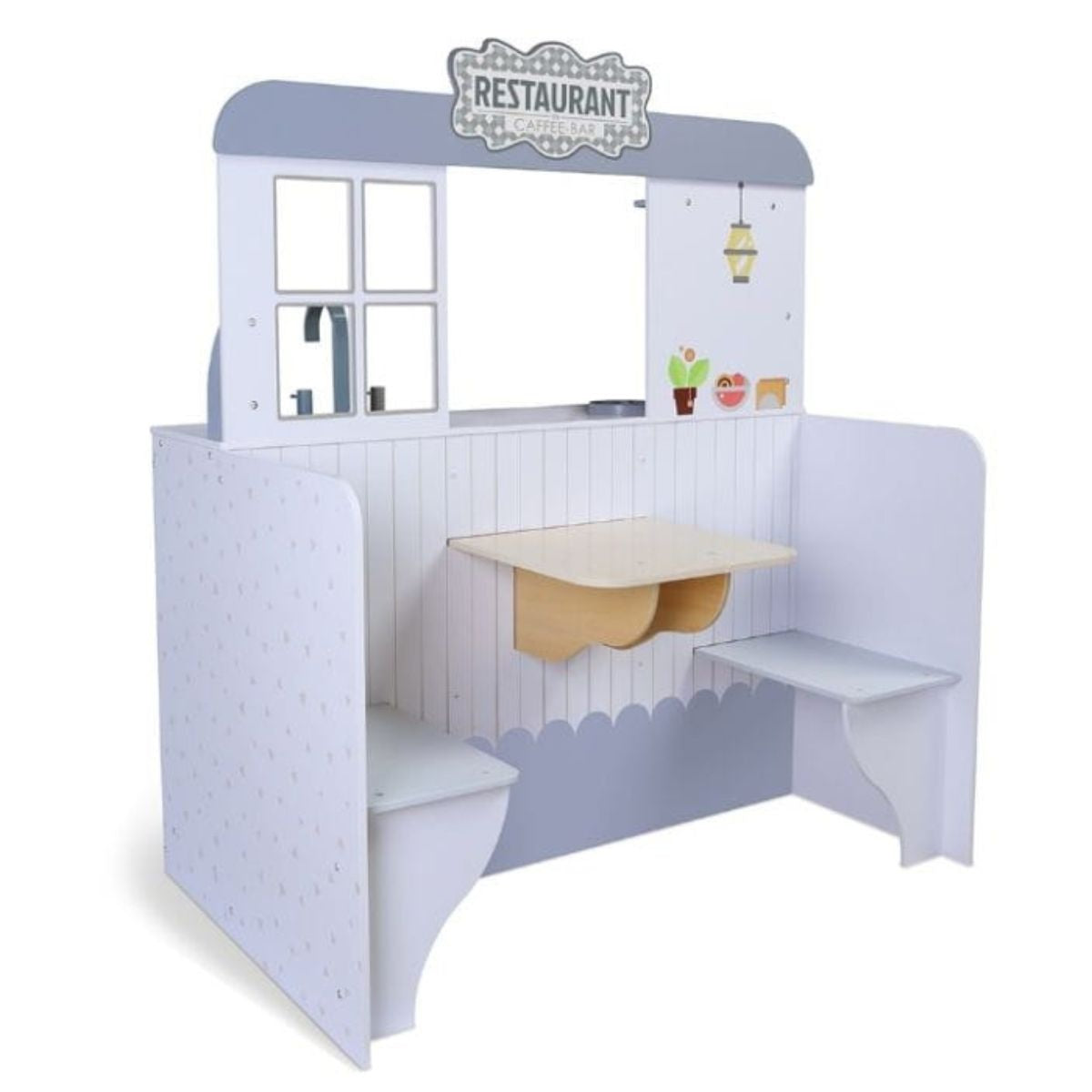 Het Gerardo’s Toys houten 2-in-1 diner brengt twee werelden samen: koken en serveren. Aan de ene kant vind je een gezellige keuken waar heerlijke gerechten bereid worden, aan de andere kant een charmant restaurant waar vrienden en familie kunnen aanschuiven. Dit veelzijdige ontwerp nodigt kinderen uit tot rollenspel, samenwerking en eindeloos fantasierijk spel.