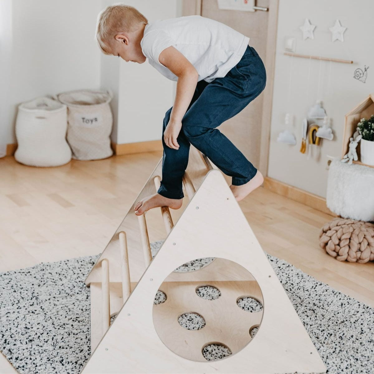 Met zijn stevige houten structuur nodigt deze driehoek uit tot klimmen, balanceren en verkennen. Peuters voelen het gladde berkenhout onder hun handen en voeten terwijl ze stap voor stap leren vertrouwen op hun eigen lichaam. Het Scandinavische ontwerp brengt een gevoel van rust en eenvoud in de ruimte — een kalme achtergrond voor groot avontuur.