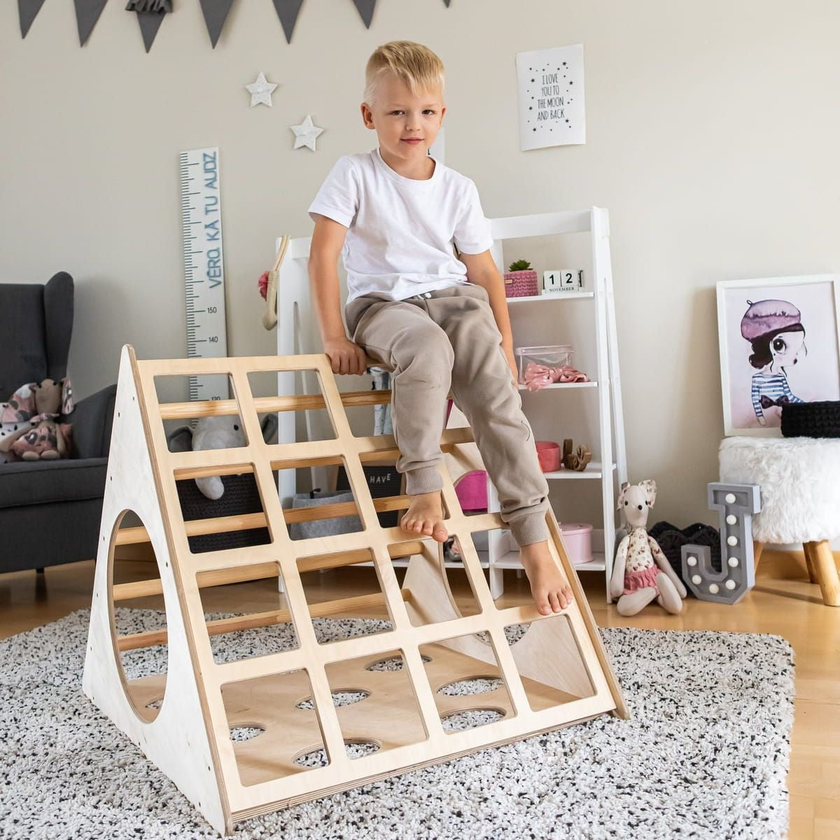 Met zijn natuurlijke uitstraling en doordachte vorm brengt deze driehoekklimmer rust in de ruimte en beweging in het kind. Ontworpen met liefde in Europa — gemaakt om jarenlang mee te groeien en elk moment van spel te vullen met harmonie en warmte.