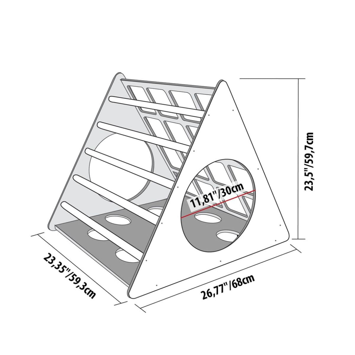 De driehoek is gemaakt van duurzaam Baltisch berkenmultiplex, met zijwanden van 1,2 centimeter dik en stangen met een diameter van 2,8 centimeter voor een stevige, kindvriendelijke grip. Met afmetingen van 68 × 59,3 × 59,7 centimeter is hij compact, maar solide genoeg voor dagelijks gebruik. Gemaakt in Letland en gecertificeerd volgens de veiligheidsnorm EN 71-8:2018, met een auteursrechtelijk beschermd ontwerp (RCD 006740270-0005, WIPO DM213839). De montage is eenvoudig en kan een rustig moment van samen bouwen worden — een klein ritueel van verbondenheid en trots.