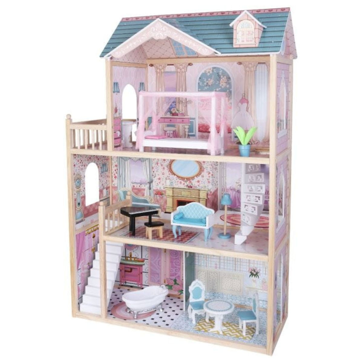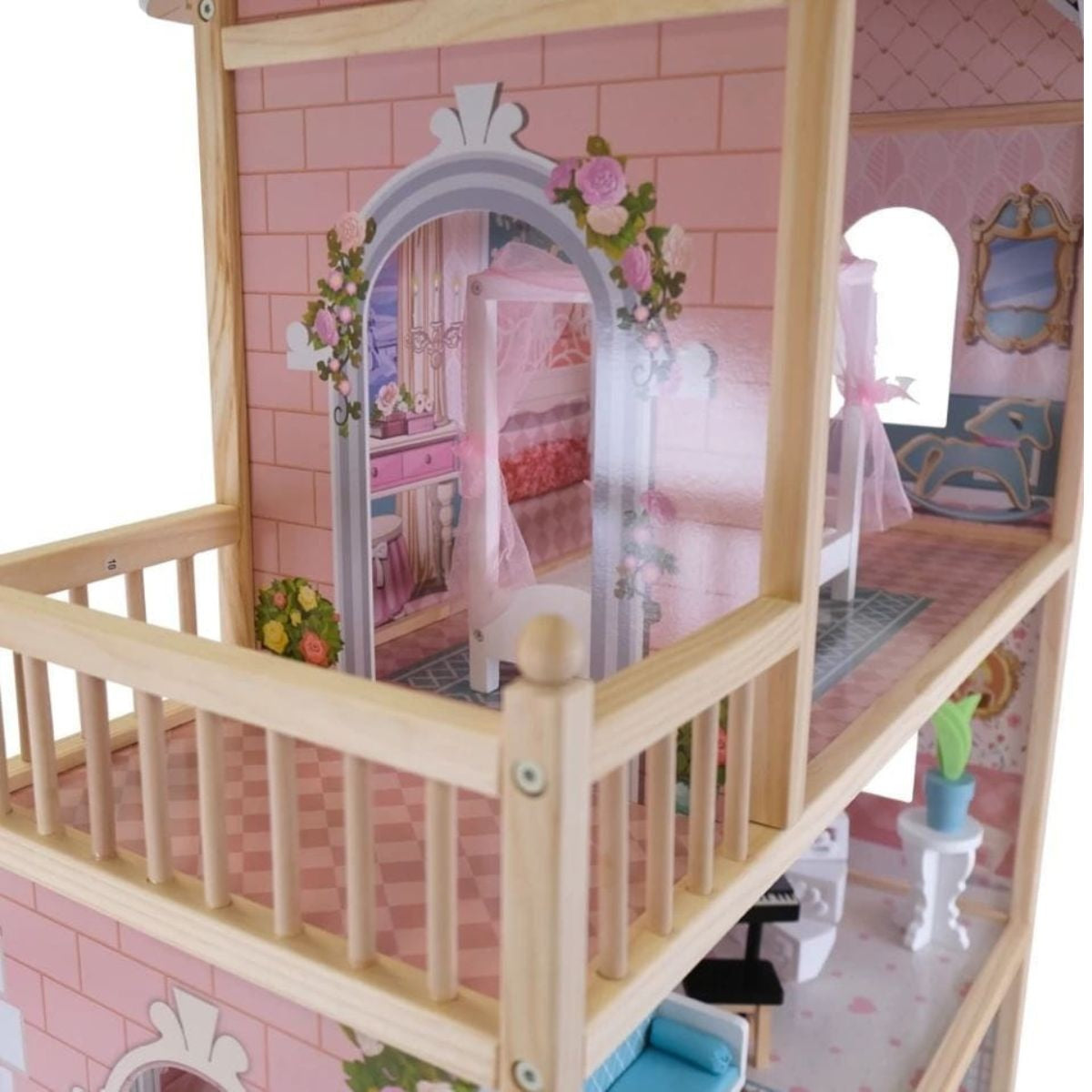 Het poppenhuis Emily is opgebouwd uit drie verdiepingen, elk met een unieke stijl en inrichting. Een houten trap verbindt de eerste en tweede verdieping, terwijl een sierlijke wenteltrap leidt naar de derde verdieping — waar een balkon uitzicht biedt over een wereld vol verbeelding. De bedrukte achterwanden voegen kleur en detail toe aan elke kamer, waardoor het huis een warme en uitnodigende uitstraling krijgt.