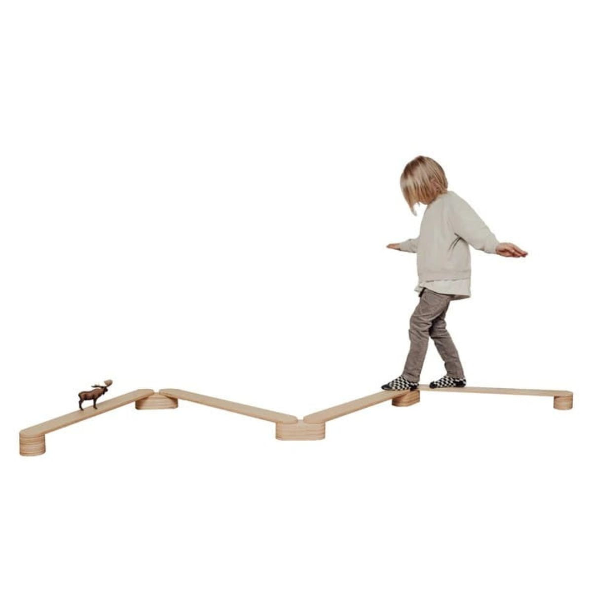De houten evenwichtsbalkenset van Leg&Go nodigt uit tot rustig bewegen, ontdekken en volgen. Laag bij de grond ontstaat een speelroute die het kind stap voor stap verkent, met aandacht voor balans, richting en vertrouwen.