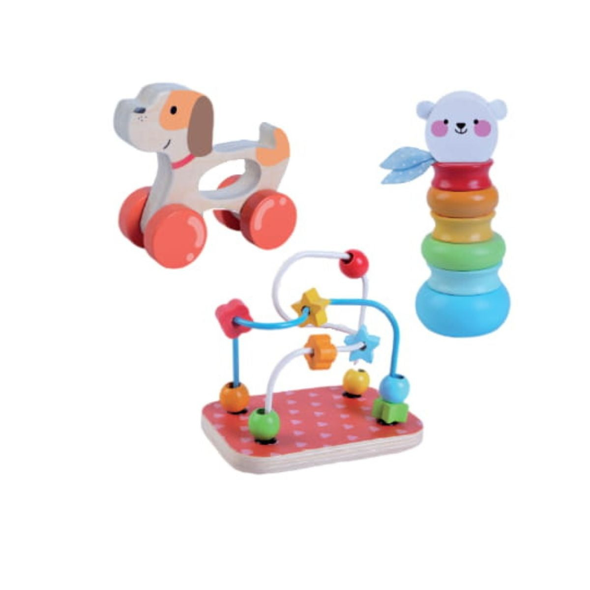 Deze set bevat drie houten speeltjes die samen zorgen voor afwisseling en uitdaging. Elk stuk moedigt een andere vaardigheid aan: grijpen, draaien of stapelen. Zo ontdekken kinderen spelenderwijs hun kracht, precisie en creatieve denken — allemaal in hun eigen tempo.
