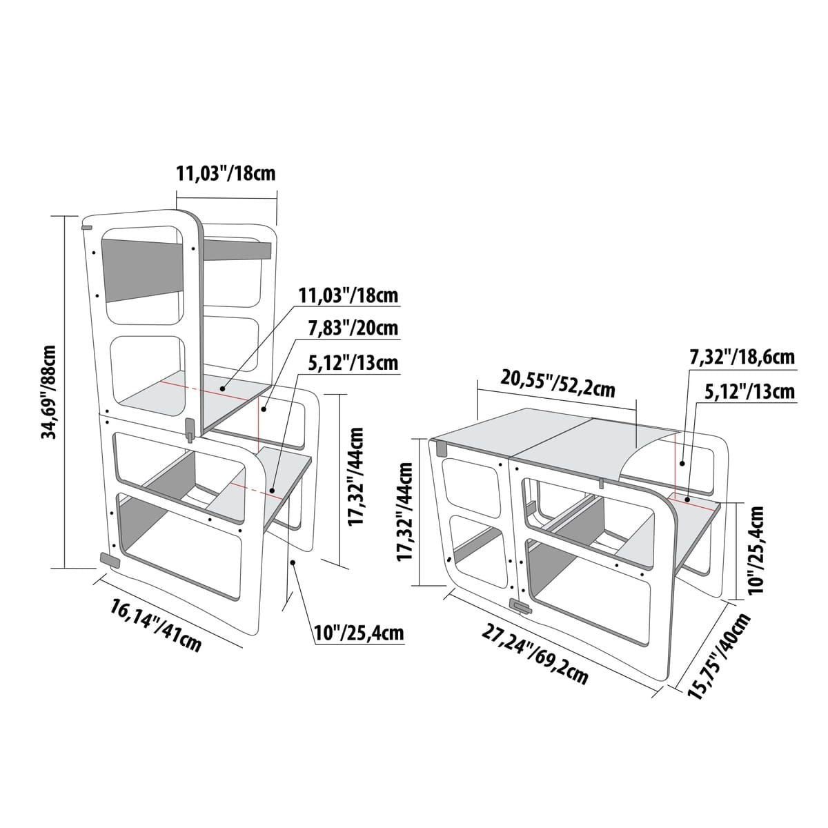 Met zorg vervaardigd uit lokale materialen binnen de Europese Unie, combineert deze keukentoren functionaliteit en esthetiek in één tijdloos ontwerp. De toren is 88 centimeter hoog, 40 centimeter breed en 41 centimeter diep, met een klimtrede op 24 centimeter en een stabiele ladder van 45 centimeter. In zijn tweede vorm verandert hij in een compacte tafel- en stoelset van 44 × 40 × 69,2 centimeter — perfect voor tekenen, eten of stille momenten van concentratie. Elk detail is handgemaakt in Letland door Montessori House Bed, met aandacht voor veiligheid, duurzaamheid en eenvoud.