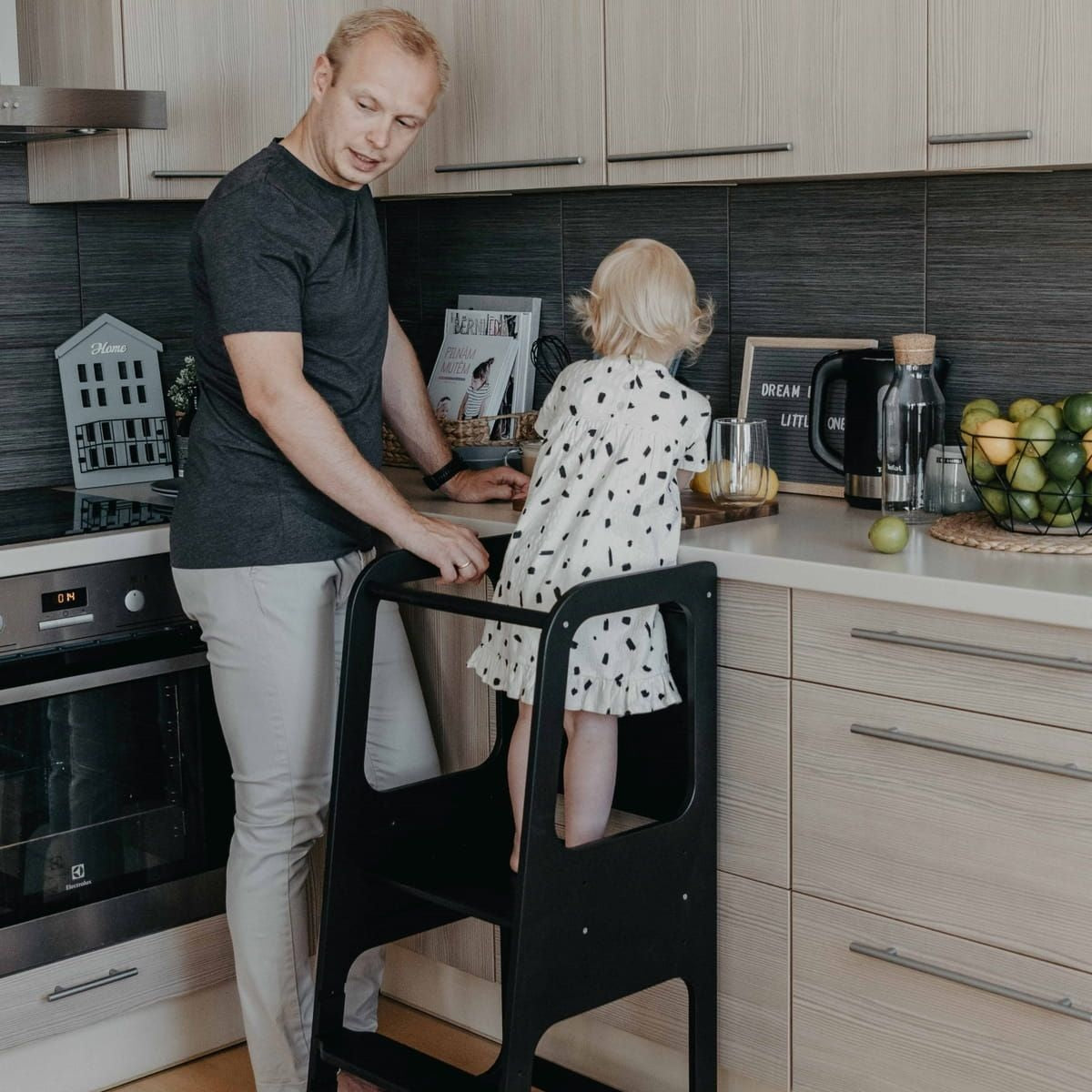 Handgemaakt in Noord-Europa van duurzaam Baltisch berkenmultiplex, is deze keukentoren stevig, kindvriendelijk en tijdloos. Met afmetingen van 90 centimeter hoog, 40 centimeter breed en 44 centimeter diep past hij perfect in elke keuken of speelkamer. De verstelbare treden (22 en 44 centimeter, elk met een verschil van 5 centimeter) groeien mee met het kind, waardoor de toren jarenlang veilig en comfortabel blijft. Het krijtbordpaneel voegt een speelse dimensie toe — ideaal om te tekenen of oefenen met schrijven terwijl ouders bezig zijn in de keuken. Elk stuk wordt met zorg handgemaakt door Montessori House Bed, met aandacht voor veiligheid, eenvoud en esthetiek.