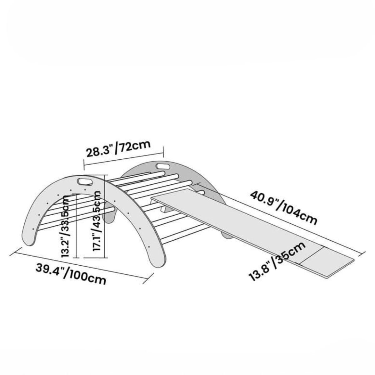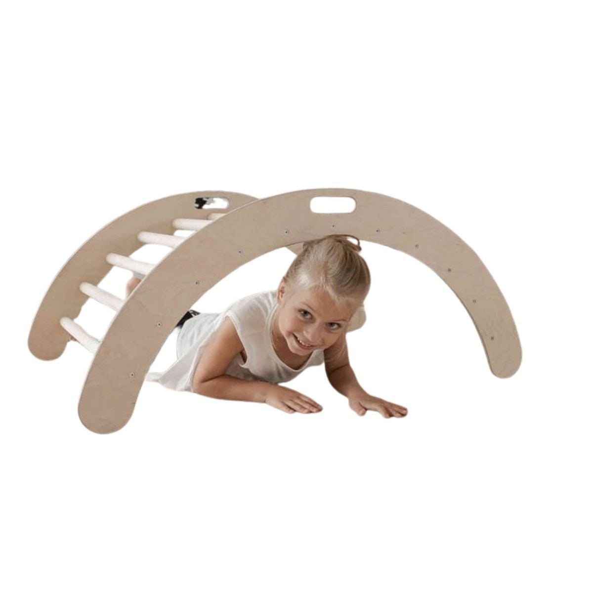 De klimboog is even veelzijdig als inspirerend. In de ene houding wordt hij een boogschommel waarin peuters zacht heen en weer wiegen, in de andere verandert hij in een klimboog of balanceerbord. Voeg een helling toe voor extra uitdaging en ontdekking. Het gladde hout nodigt uit tot aanraken, de ronde vormen geven een gevoel van veiligheid en harmonie — een rustige plek waar plezier en concentratie elkaar ontmoeten.