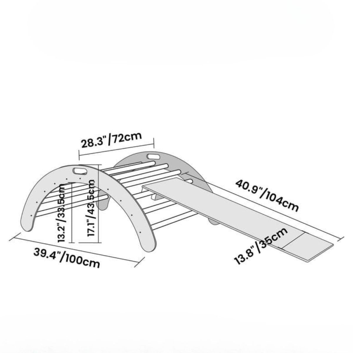De klimboog verandert met elke speeldag. In de ene stand is het een boogschommel waarop peuters hun evenwicht oefenen en zachtjes wiegen, en in de andere een stevige klimboog of balanceerbord. Voeg de helling toe om te glijden of te klimmen, en er ontstaat een kleine binnengym vol avontuur. Het gladde hout voelt warm aan, de gebogen lijnen brengen harmonie in de kamer — een rustige plek waar spel en ontdekking elkaar ontmoeten.