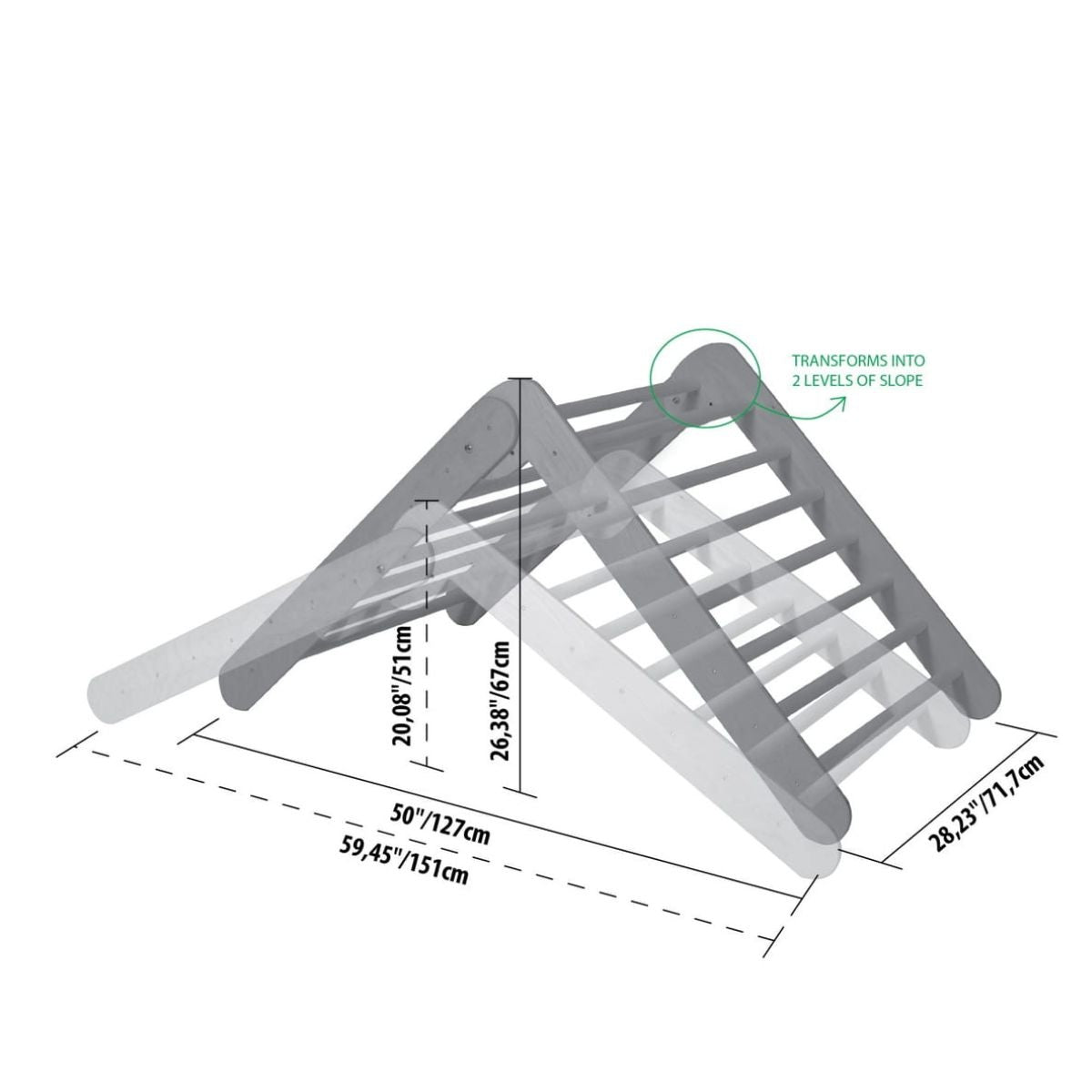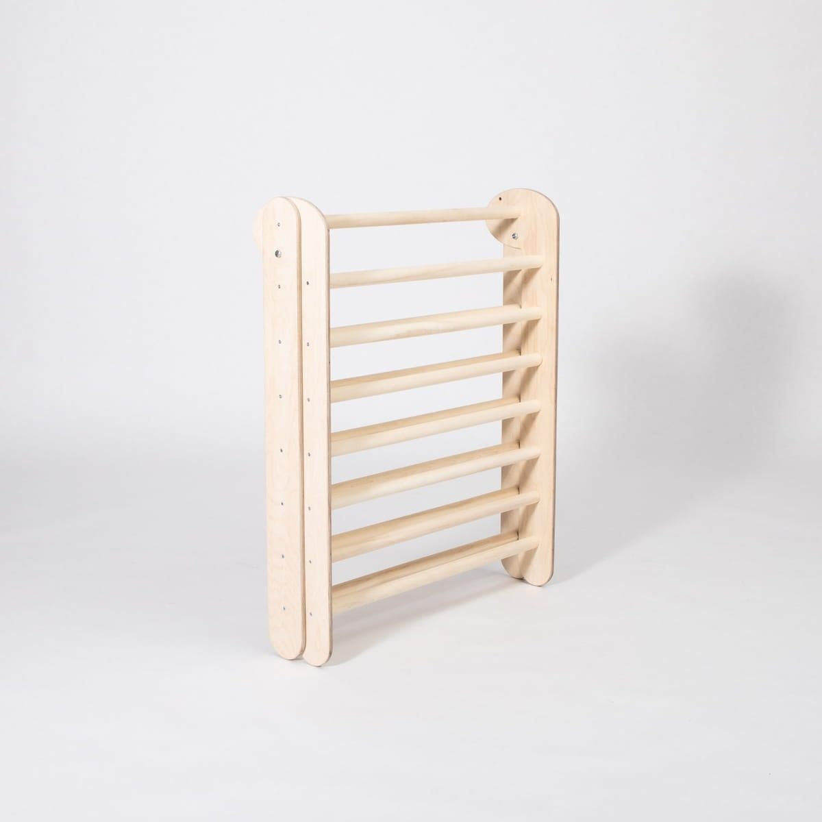 Met een breedte van 71,7 cm en een gewicht van slechts 9,4 kg is deze klimdriehoek eenvoudig op te bergen dankzij het slimme, opvouwbare ontwerp. Ideaal voor gezinnen die waarde hechten aan functionaliteit, veiligheid en stijl in een compacte woonruimte. Het natuurlijke hout en de minimalistische vorm passen moeiteloos in elk Montessori-, Japandi- of Scandinavisch interieur.