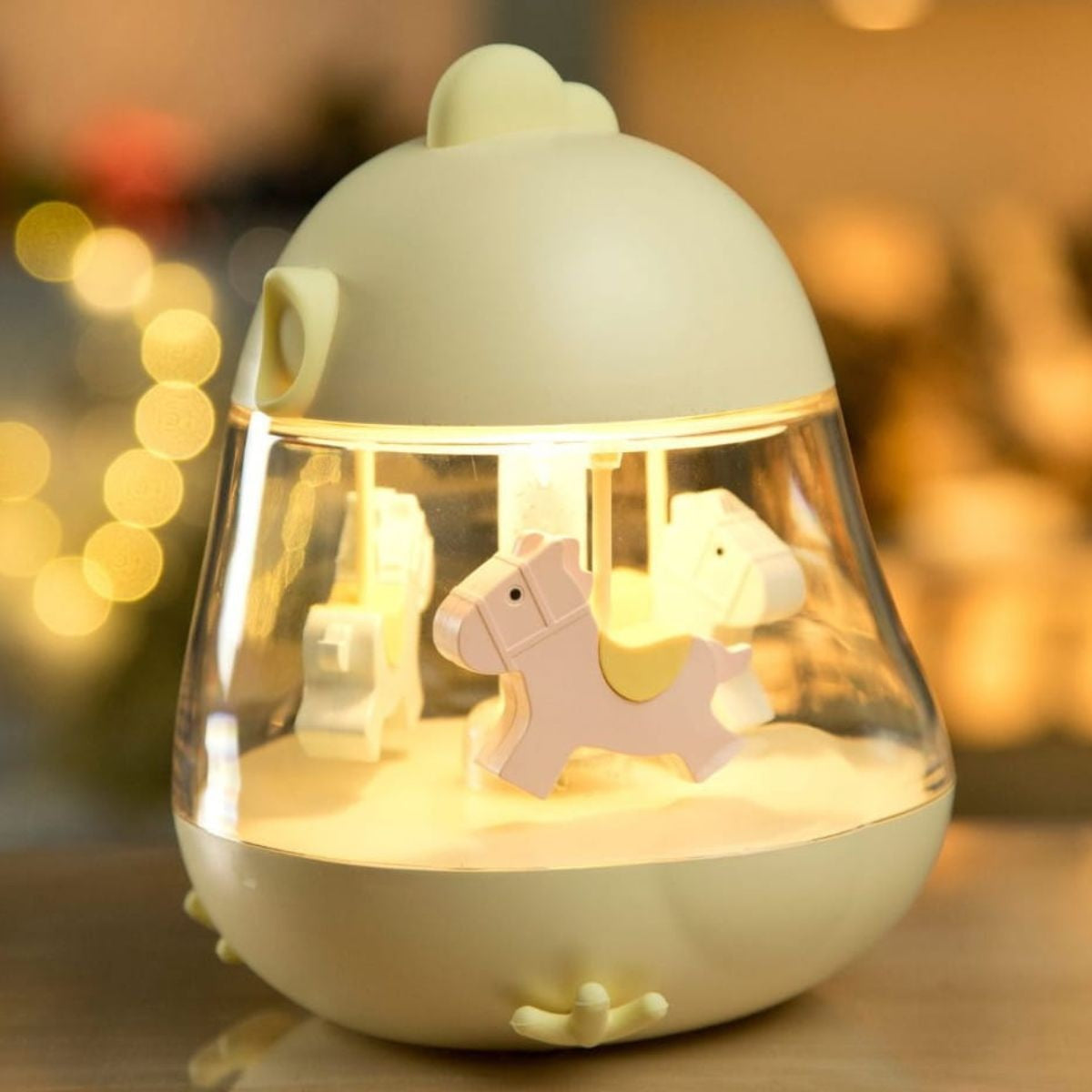 De lamp heeft een ingebouwd muziekdoosje dat met de hand wordt opgewonden via de metalen draaiknop aan de voet. Terwijl de paarden rustig ronddraaien, klinkt een tedere melodie die helpt bij het tot rust komen van het kind. Door zacht op de knop boven op de koepel te tikken, kan de lichtintensiteit worden aangepast — van helder tot zacht — of kan de kleurmodus worden geactiveerd. De lamp wisselt geleidelijk tussen zeven zachte tinten en schakelt automatisch over naar slaapstand na acht uur gebruik. Zo blijft de kamer gehuld in een geruststellend, dromerig licht.