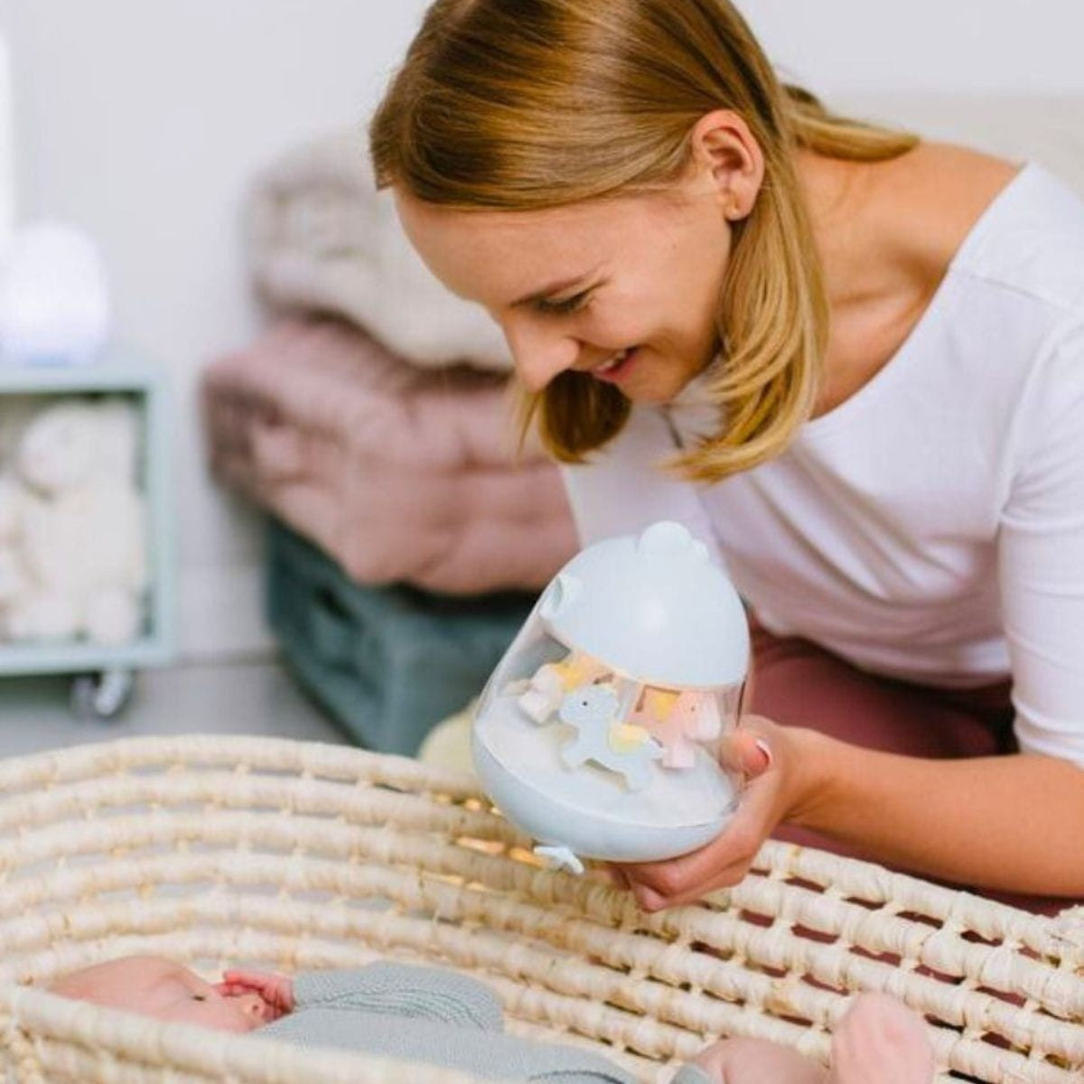 De blauwe Rabbit & Friends lamp met draaimolen en muziekdoosje brengt rust en magie in de kamer. Ontworpen met zorg — om licht, melodie en geborgenheid samen te brengen in een moment van sereniteit.