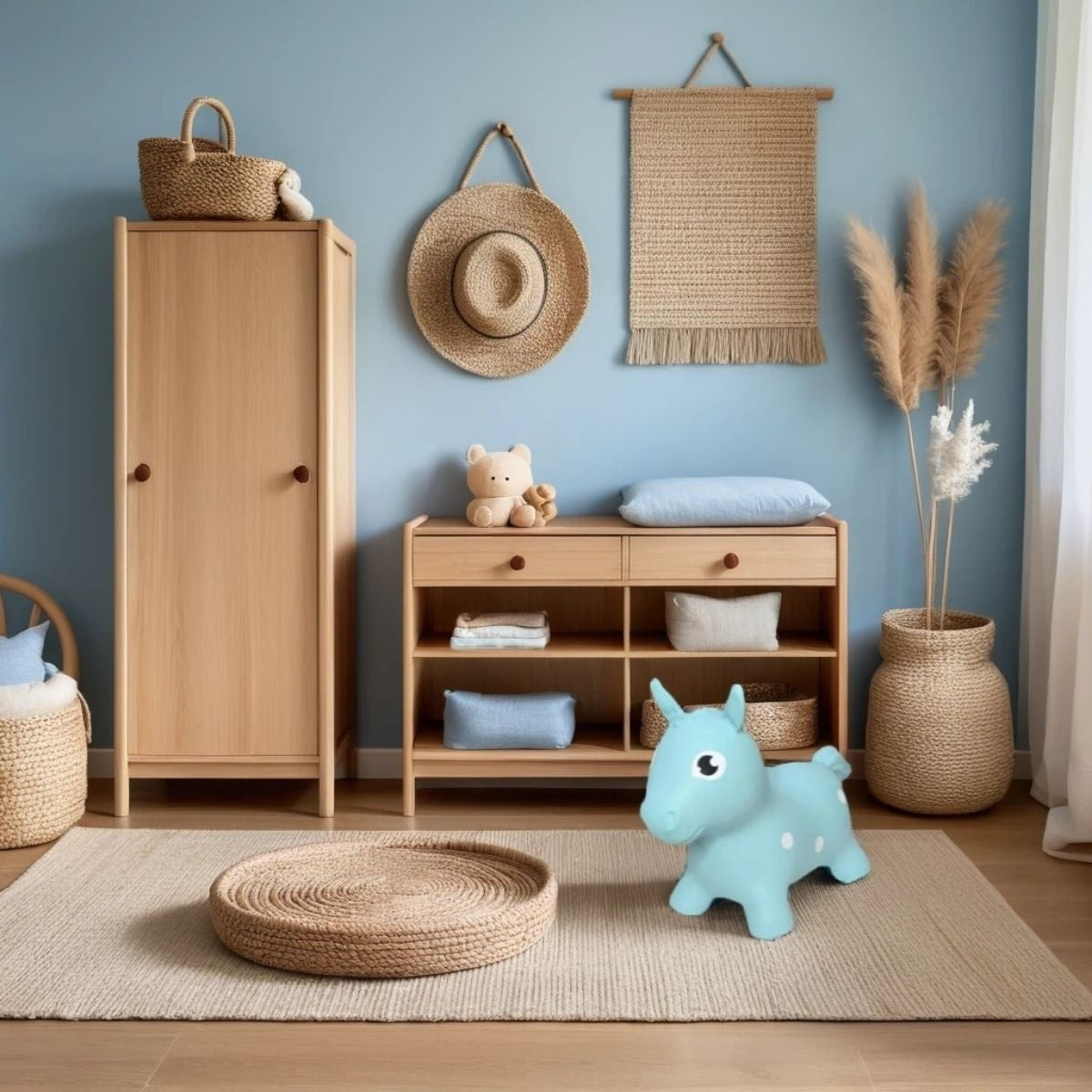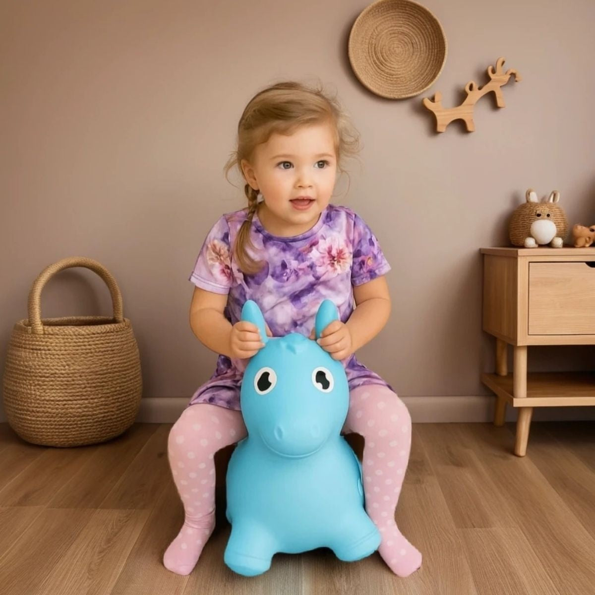 De ronde, zachte vorm van het blauwe springpaard geeft stabiliteit en geborgenheid. Dankzij het antislipmateriaal voelt elk sprongetje veilig, zowel binnen als buiten. De rustige kleur brengt harmonie, terwijl het ritmische spel energie en concentratie in balans houdt.