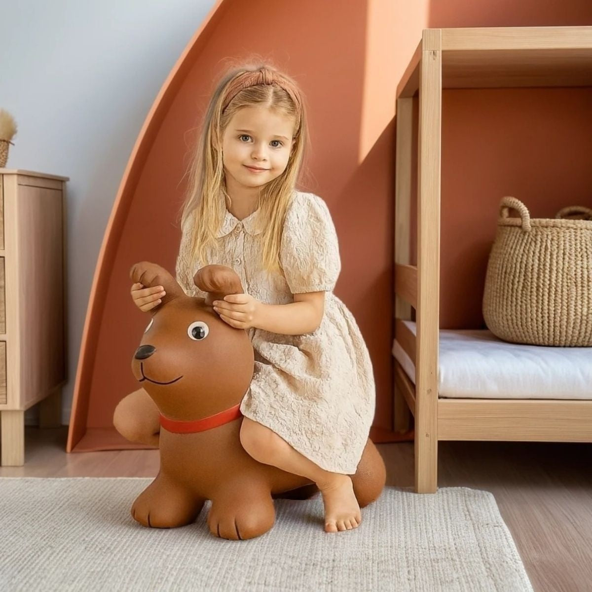 De zachte ronde vormen maken deze springhond veilig en uitnodigend. Het duurzame, antislipmateriaal zorgt voor houvast, zowel binnen als buiten. De warme bruine kleur straalt rust en geborgenheid uit — als een trouwe vriend die altijd klaarstaat om mee te spelen.