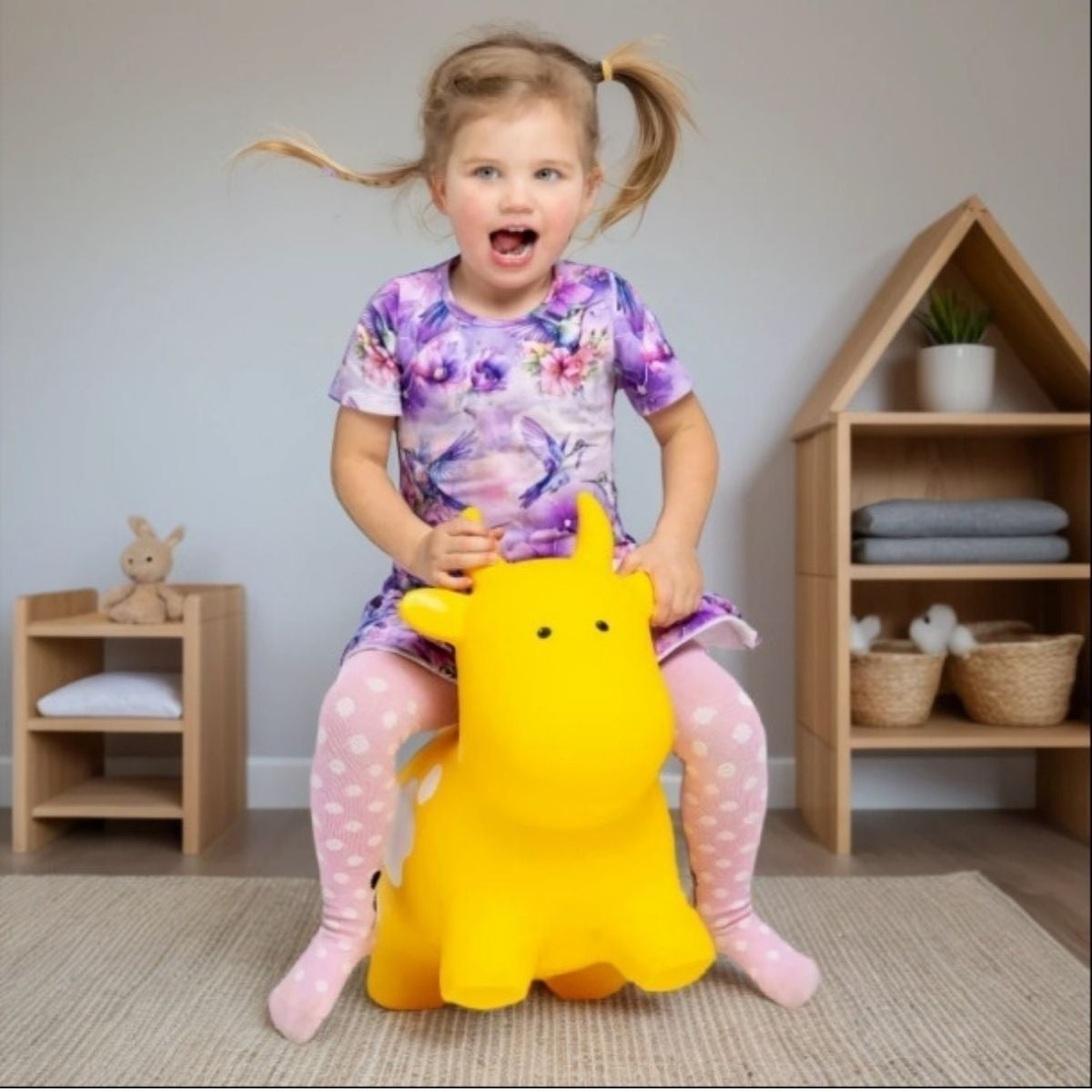 De gele springkoe uit de My First Jumpy-collectie brengt licht en levenslust in elke speelkamer. Haar warme tint straalt vreugde uit en nodigt kinderen uit tot beweging, lachen en ontdekken. Elke sprong voelt als zonnestralen op de huid — energiek, warm en vol plezier.