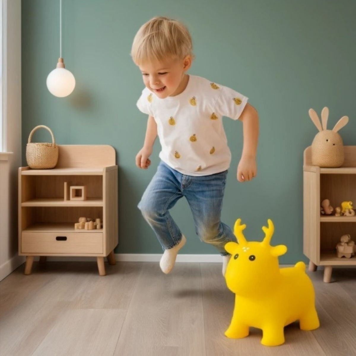 Het gele springrendier uit de My First Jumpy-collectie straalt licht, energie en vrolijkheid uit. De zonnige tint brengt warmte in elke ruimte en nodigt kinderen uit om vol enthousiasme te bewegen. Elke sprong voelt levendig, luchtig en vol plezier — als dansen in de zon.