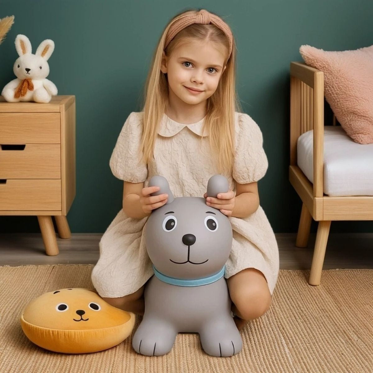 De grijze springhond bevordert coördinatie, evenwicht en spierkracht. Tijdens het springen leren kinderen hun lichaam te beheersen en hun ritme te vinden. De rustige kleur helpt concentratie en vertrouwen te versterken, wat zorgt voor kalm spel en innerlijke stabiliteit.