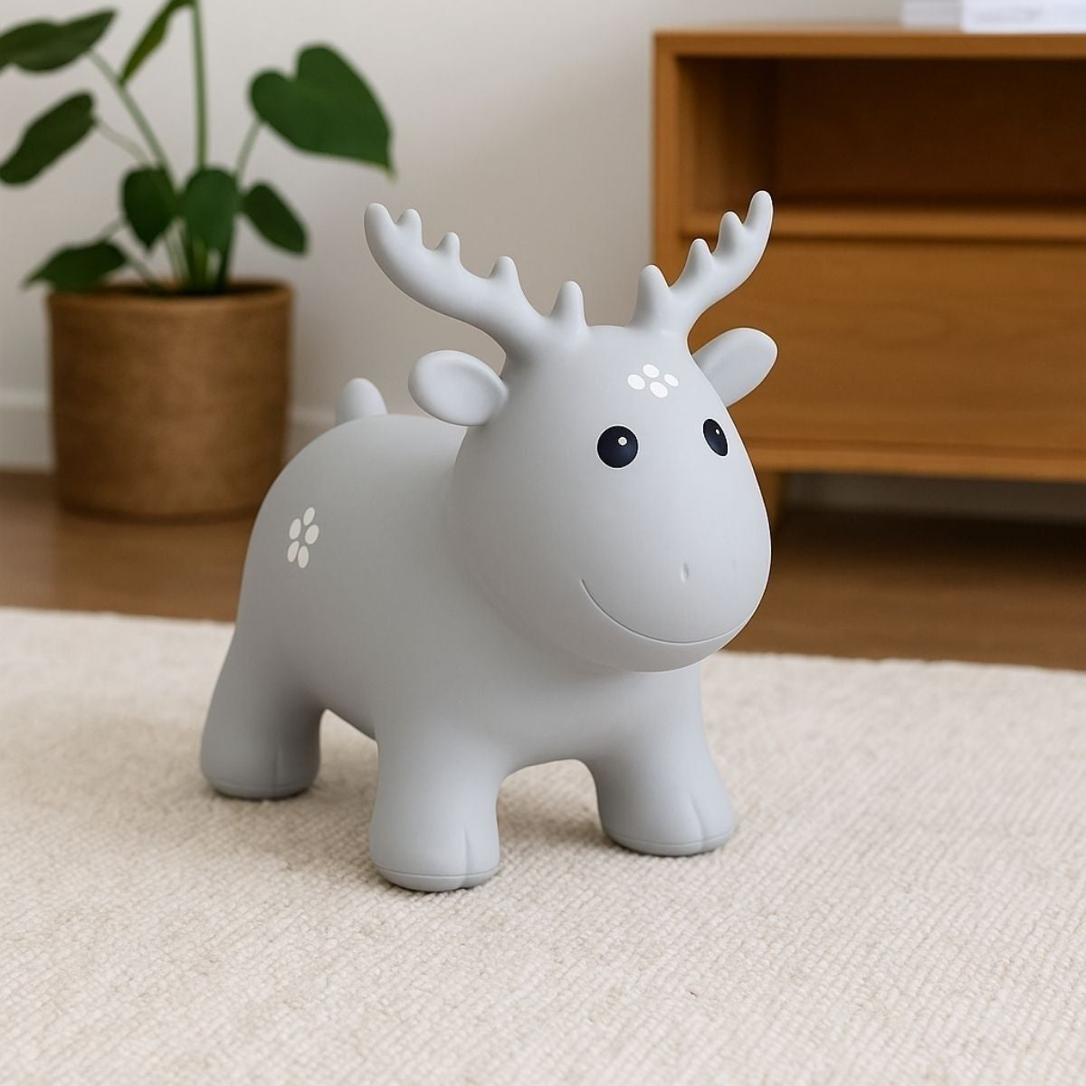 Het grijze springrendier bevordert balans, coördinatie en spierontwikkeling. Door ritmisch te springen leren kinderen hun lichaam te beheersen en te ontspannen. De neutrale kleur ondersteunt een gevoel van kalmte — een rustpunt in actief spel.