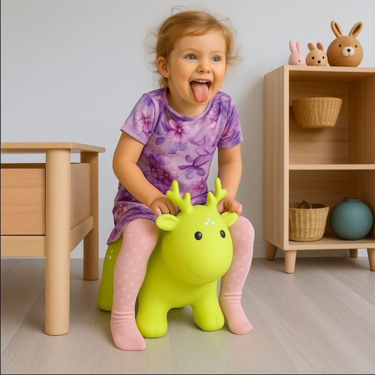 Het groene springrendier uit de My First Jumpy-collectie brengt de frisheid van de natuur tot leven. De levendige kleur straalt groei en balans uit, terwijl het kinderen uitnodigt om vrij te bewegen, te ontdekken en te spelen. Elke sprong voelt natuurlijk, licht en vol levenskracht.
