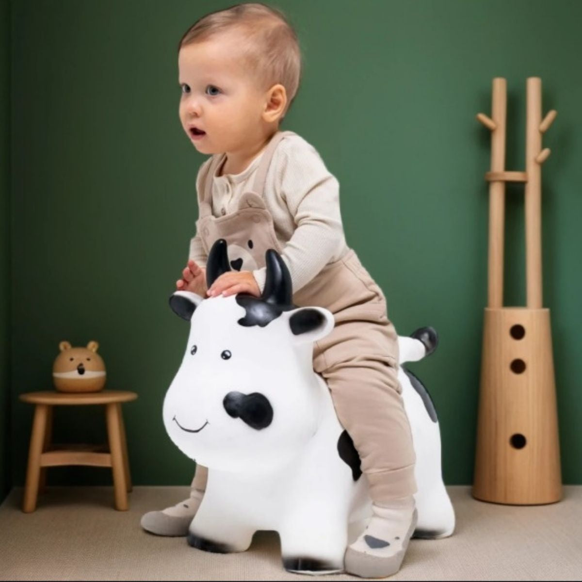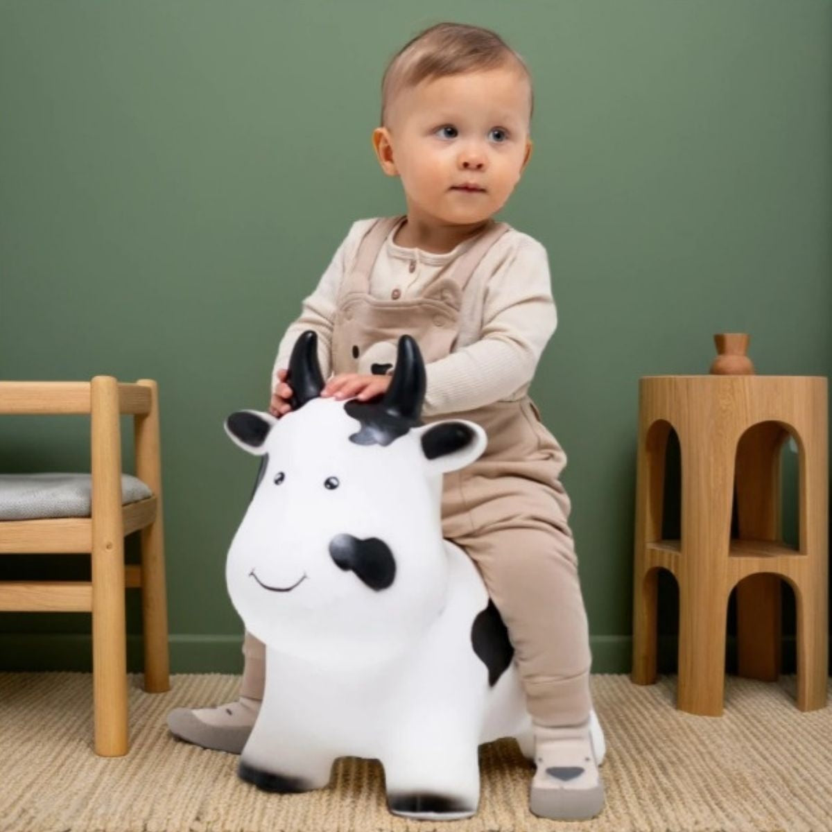 De afgeronde vormen en stevige bouw van de witte springkoe maken spelen veilig en zorgeloos. Het antislipmateriaal biedt houvast bij elke sprong, binnen of buiten. De neutrale kleur creëert rust en bevordert een gevoel van stabiliteit tijdens het spelen.