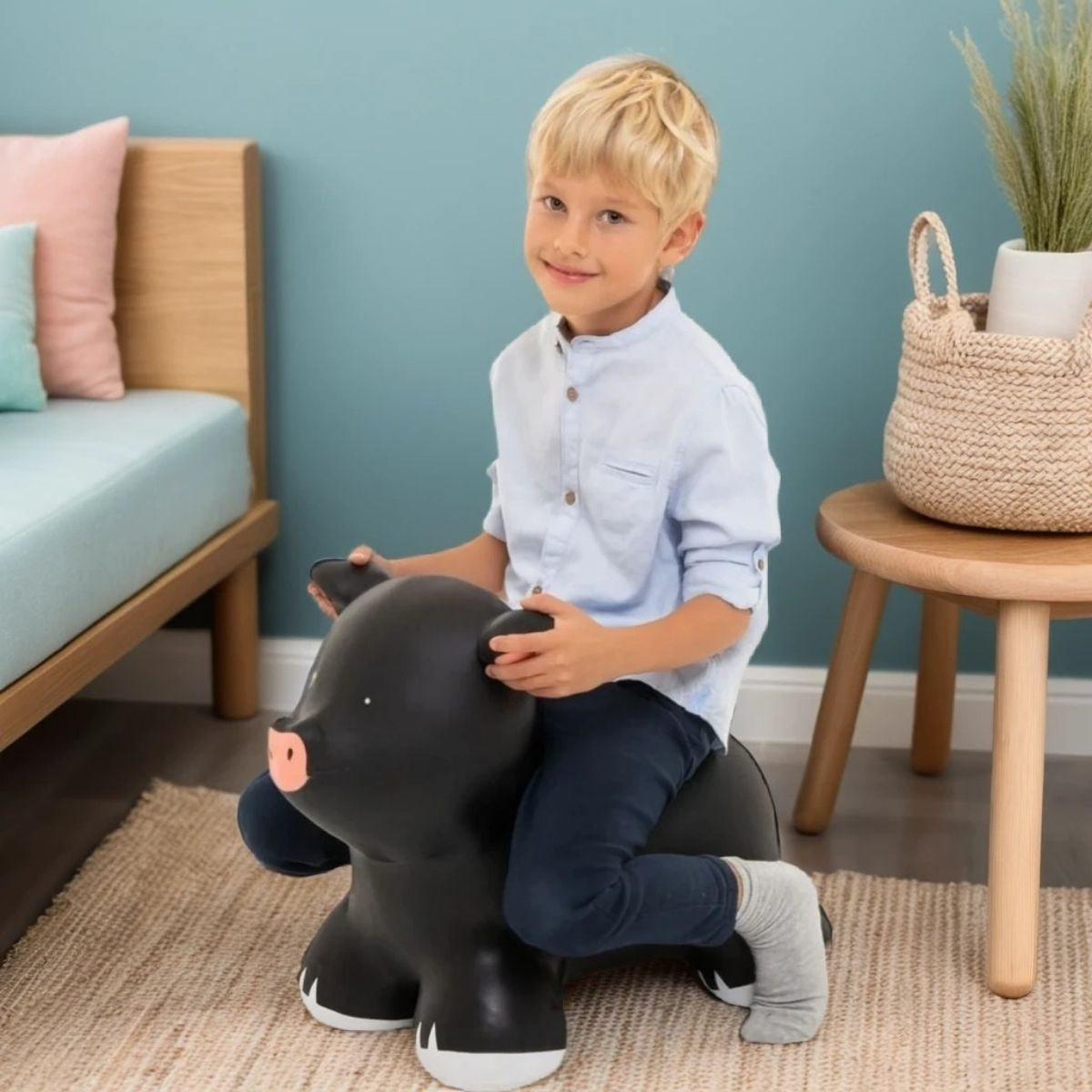 Het springvarkentje stimuleert balans, kracht en coördinatie. Terwijl kinderen ritmisch springen, bouwen ze spierkracht op en vergroten ze hun zelfvertrouwen. De zachte uitstraling en organische vormen brengen rust, veiligheid en spelplezier in elk moment.