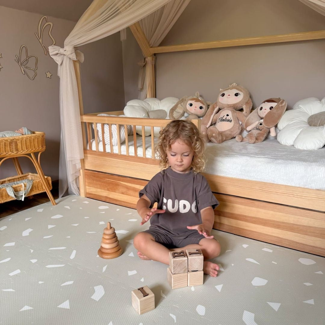 De OLYA KIDS “Terrazzo Dove” speelmat brengt een zachte, verfijnde uitstraling in huis. De rustige duifgrijze tint en het subtiele terrazzo-patroon vormen een kalme basis waar je baby ongestoord kan spelen, kruipen en ontdekken. Een veilige plek die past bij het ritme van alledaagse momenten.